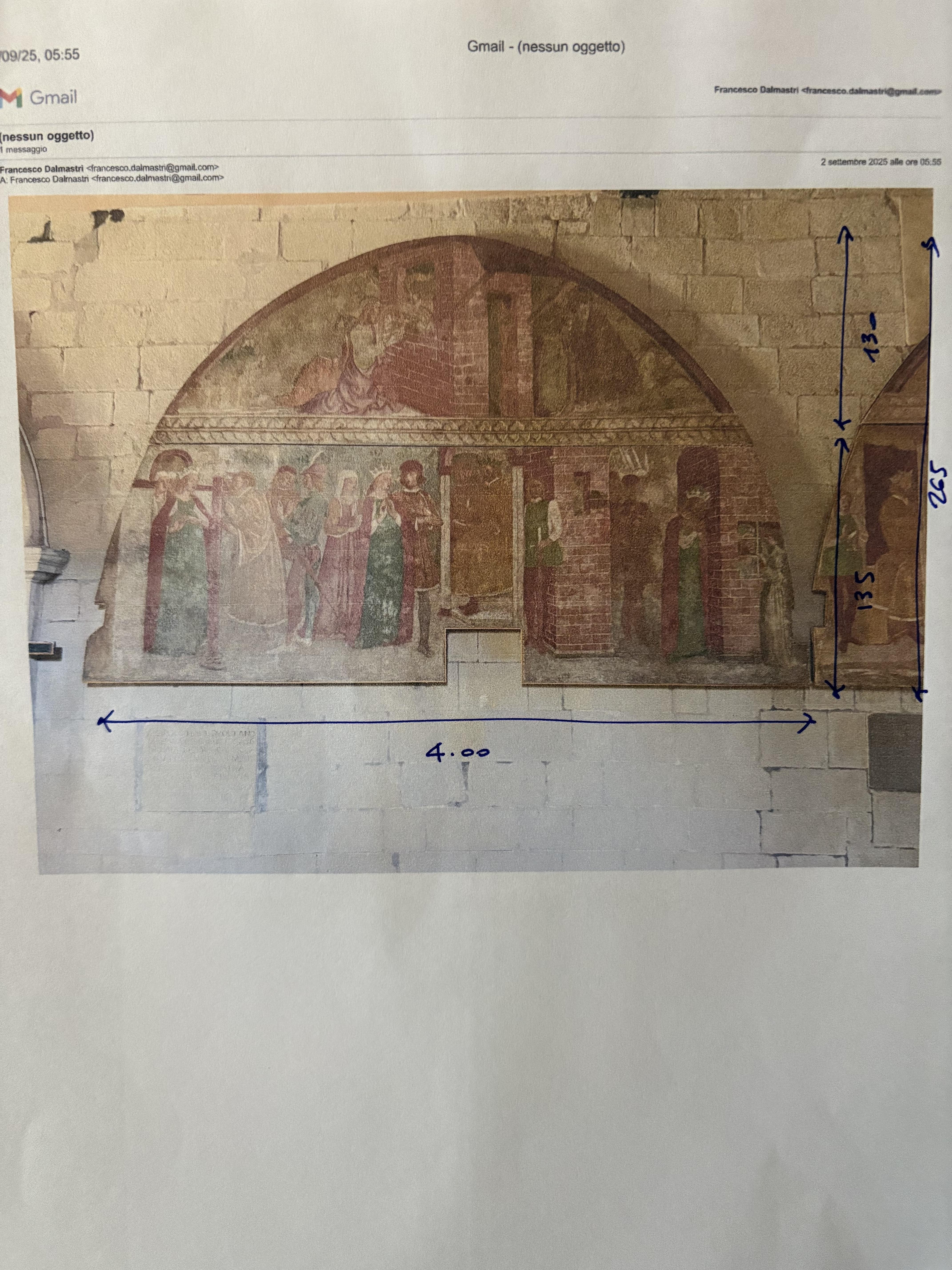 A distanza di una quarantina di anni dall’ultimo intervento di restauro ad opera di Camillo Tarozzi nei primi anni ‘80 del ‘900, il soggetto proprietario si propone intervenire con un nuovo progetto di restauro per la risoluzione della precaria condizione conservativa, che permetta altresì di eliminare tutte le deformazioni presenti con il recupero della planarità superficiale originaria, caratteristica principale delle opere realizzate ad affresco su muro, nonché di garantire un quoziente conservativo ottimale all’opera tramite l’interposizione di uno strato isolante sul retro, durante le fasi operative di rifoderatura e consolidamento; l’intervento prevede altresì: