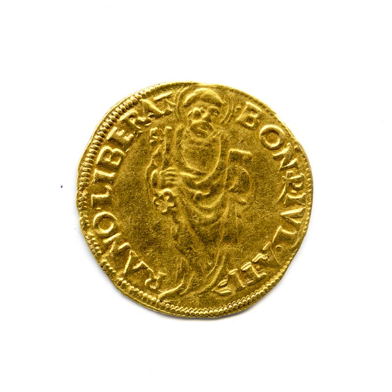 (Ducato Papale, D. IVLIVS.II. PONT.MAX, stemma dei Della Rovere in decagono in quadrilobo chiavi legate da cordone, R. BON.P.IVL.A.TI RANO.LIBERAT (tr: Bologna da Papa Giulio dal Tiranno liberata), Bologna, Museo Civico Archeologico.