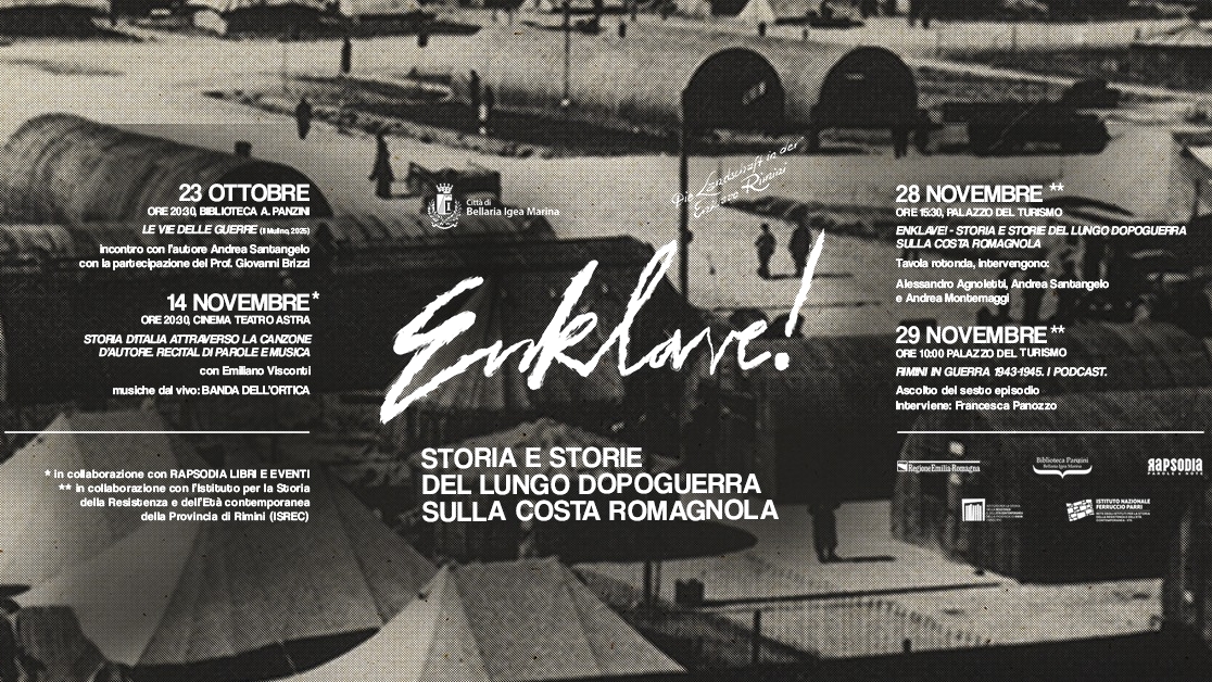 “Enklave! Storia e storie del lungo dopoguerra sulla costa romagnola” è il titolo della rassegna di eventi che la Biblioteca comunale “Alfredo Panzini” di Bellaria Igea Marina (Rimini), con il contributo concesso dalla Regione Emilia-Romagna in base alla legge 3/2016 “Memoria del Novecento”, ha dedicato alle vicende della vasta area di internamento di prigionieri di guerra allestita dagli alleati sul litorale alla fine del secondo conflitto mondiale.