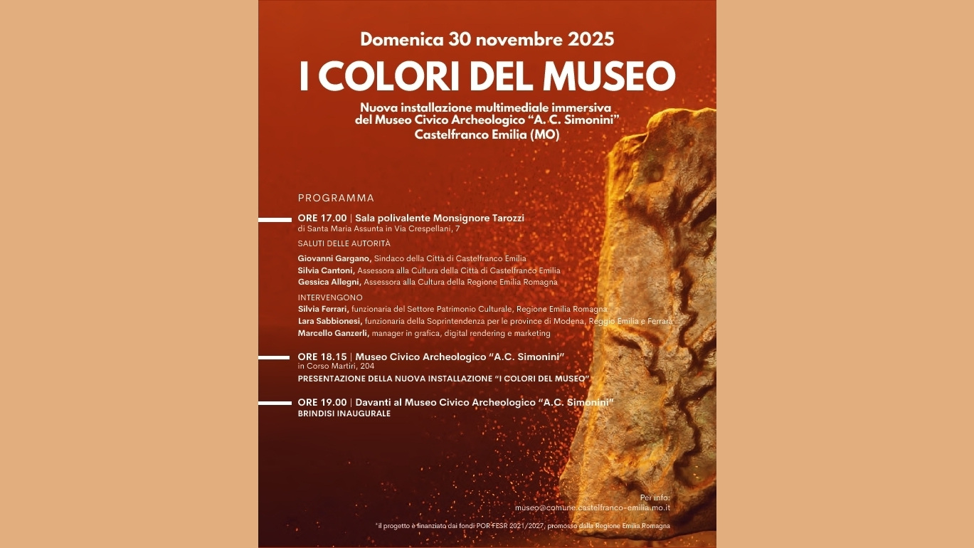 Domenica 30 novembre 2025, alle ore 17, a Castelfranco Emilia (Modena), il Museo civico archeologico “Anton Celeste Simonini” presenta “I Colori del Museo”, una nuova installazione multimediale immersiva che, attraverso luce, suono e tecnologia, propone un inedito percorso di scoperta e valorizzazione dell’antica storia della città.