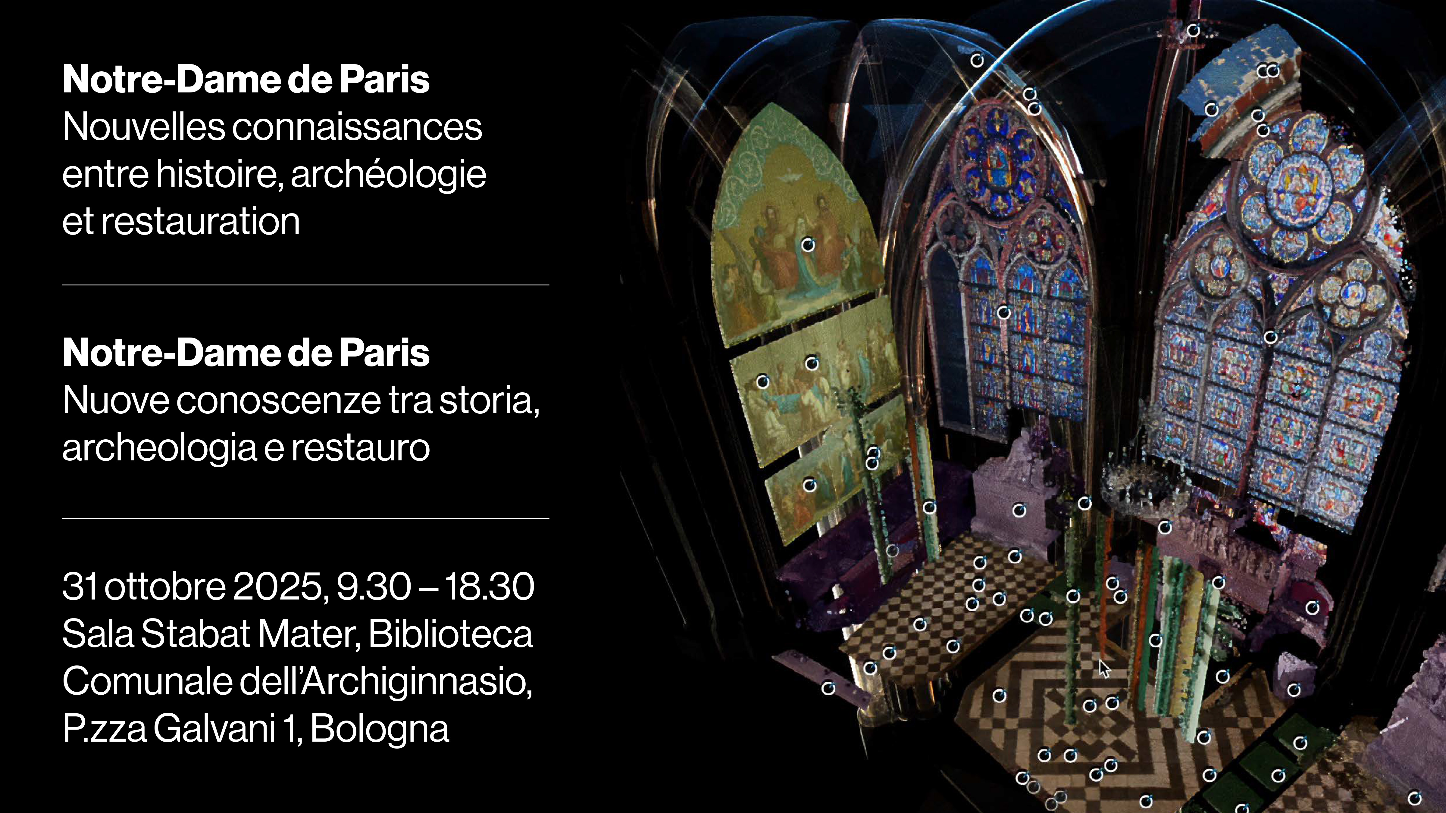 Il 31 ottobre, dalle 09:30 alle 18:30, nella Sala Stabat Mater dell'Archiginnasio, si tiene una giornata di studi a sei anni dall'incendio che ha devastato la cattedrale simbolo di Parigi, Alcuni dei più importanti studiosi e responsabili delle attività presenteranno le scoperte riguardanti non solo il monumento ma anche l’architettura e l’arte dal XIII secolo ad oggi, le tecniche e le teorie del restauro, le scoperte archeologiche, le analisi scientifiche, la costituzione dei sistemi informativi.