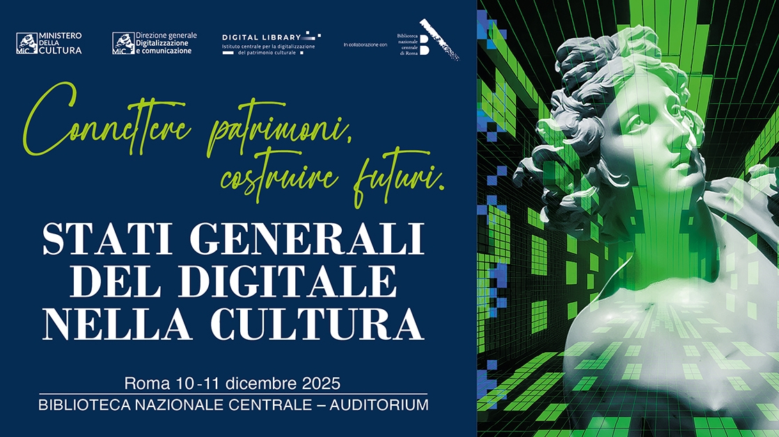 Mercoledì 10 e giovedì 11 dicembre 2025, nell’Auditorium della Biblioteca Nazionale Centrale di Roma, si svolgono gli “Stati generali del Digitale nella Cultura”. Il convegno, che ha per tema “Connettere patrimoni, costruire futuri”, è organizzato dal Ministero della Cultura - Direzione generale Digitalizzazione e comunicazione e dall’Istituto centrale per la digitalizzazione del patrimonio culturale - Digital Library.