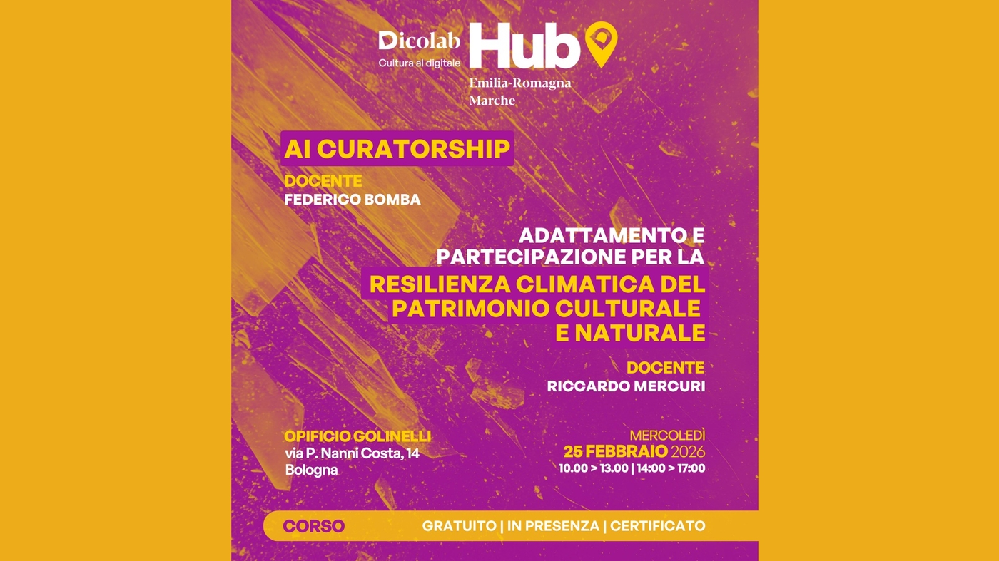 Proseguono le attività proposte dall’Hub Emilia-Romagna e Marche di “Dicolab. Cultura al Digitale”, il sistema formativo per la trasformazione digitale del patrimonio culturale promosso dal Ministero della Cultura - Digital Library nell’ambito del PNRR Cultura 4.0, realizzato dalla Scuola nazionale del patrimonio e delle attività culturali, e finanziato dall’Unione Europea - Next Generation EU. Mercoledì 25 febbraio 2026, all’Opificio Golinelli di Bologna, sono in programma due corsi di formazione gratuiti.